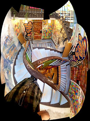 Photosynth messed up the photo in the most wonderful way. It got confused by the spiral stairwell and started turning it in on itself, with what I think is a great result (that's me at the bottom left in the green shirt). I'm forgetting the name of the guy, but it looks like one of those logically impossible drawings of the staircases that twist into each other forever (or like a staircase at Hogwarts).